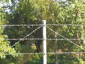 Barbed wire fences remain the standard fencing technology for enclosing cattle. The wire is aligned under tension between heavy, braced, fence posts (strainer posts) and then held at the correct height by being attached to wooden posts and battens, or steel star posts. The gaps between star posts vary depending on terrain. On short fences in hilly country they may be placed every 3?yards (2.7?m), while in flat terrain with long spans and relatively few stock they may be spaced up to 30 to 50?yards (46?m. Many farmers place posts 2 meters apart as battens can bend causing wires to close in on one an). Wooden posts are normally spaced at 2 rods (10 m) in any case with 4 or 5 battens in between other.